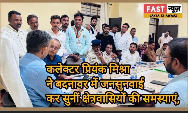 *बदनावर* — कलेक्टर प्रियंक मिश्रा ने मंगलवार को बदनावर के अनुविभागीय अधिकारी कार्यालय में पहुंचकर जनसुनवाई की। इस दौरान उन्होंने क्षेत्रवासियों से सीधी बातचीत कर उनकी समस्याएं, शिकायतें और मांगें सुनीं। लगभग 50 क्षेत्रवासियों ने अपनी बातों को लेकर आवेदन प्रस्तुत किए।