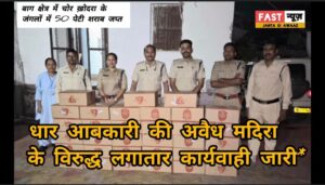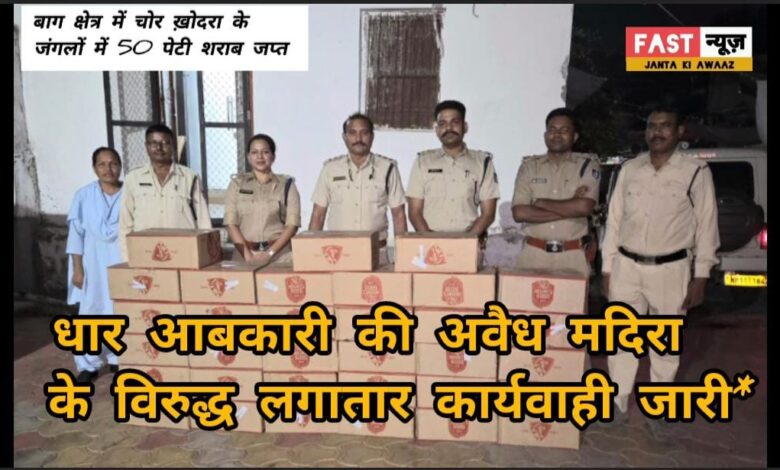 *दिनांक 12/05/2025 को सहायक आबकारी आयुक्त जिला धार श्री राजनारायण सोनी को मुखविर से सूचना प्राप्त हुई कि गंधवानी वृत्त के बाग क्षेत्र में चोर ख़ोदरा के जंगलों में नाले किनारे बने मकान में एक व्यक्ति द्वारा 50 पेटी शराब पेटियां उतारी हैं । सहायक आबकारी आयुक्त श्री राजनारायण सोनी जी द्वारा तत्काल रात्रि में ही सहायक जिला आबकारी अधिकारी नागेन्द्र सिंह जादौन के नेतृत्व में एक टीम गठित की गई ।* टीम द्वारा तुरंत चोरखोदरा के जंगलों में दबिश दी गई तो एक सूने मकान से 33 पेटी माउंट-6000 बियर कैन कुल मदिरा 396 बल्क लीटर जप्त कर अज्ञात के विरुद्ध म.प्र. आबकारी अधिनियम, 1915 की धारा 34(2) के तहत प्रकरण पंजीबद्ध किया । जप्त मदिरा का कुल मूल्य लगभग 1,03,000/- रुपए है ।