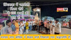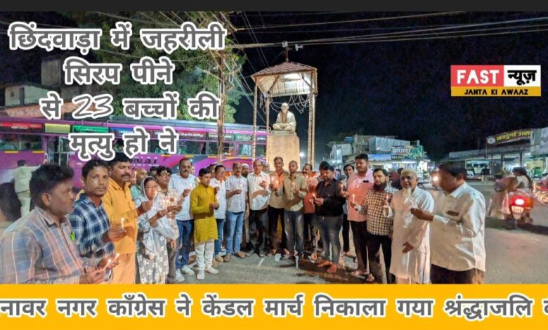 जहरीली सिरप पीने से 23 बच्चों की मृत्यु हो गई और अनेक बच्चे गंभीर रूप से बीमार हो गए थे उन बच्चों को केंडल मार्च निकाला गया श्रंद्धाजलि दी और स्वास्थ्य मंत्री राजेंद्र शुक्ला के इस्तीफे की मांग की गई इस अवसर पर वरिष्ठ कांग्रेस नेत्री आपा अख्तर बी, सिराज मंसूरी, निरंजन डावर,राजेश पंवार जाकिर नूरी खत्री ,योगेश जख्मी, अमर सेन ,अरुण गर्ग, लोकेश पाटीदार आरिफ मंसूरी और मनावर विधायक डॉ हीरालाल अलावा टीम सहित अनेक कांग्रेस कार्यकर्ता उपस्थित थे जानकारी