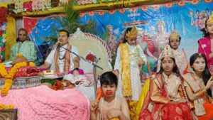 *आपको बता दे कथा के नवम दिवस पर लंकापति रावण की मुक्ति के बाद भगवान राम का राज्याभिषेक बड़ी धूमधाम के साथकिया गया कथा में भगवान श्री राम के राज्याभिषेक का प्रसंग आने पर छोटे-छोटे मासूम बच्चों के द्वारा भगवान के रूप में परिसर पर आगमन होते ही राजा रामचंद्र भगवान की जय के नारे से पंडाल भुज उठा*