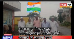 दोस्ताना ग्रुप निसरपुर द्वारा प्रतिवर्षानुसार इस वर्ष भी 79 यौमे आजादी के मौके पर अबुल कलाम चौराहे पर इस्लामिया अंजुमन कमेटी के नव निर्वाचित सदर अशरफ भाई पठान के द्वारा झंडा फहराया गया।इस मौके पर अबरार भाई, अफजल को मंसूरी,हाजी अजीज मास्टर साहब, ज़ाकिर भाई ,वाहिद भाई ,और आबिद भाई मौजूद थे।